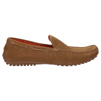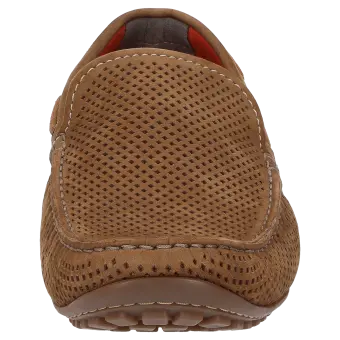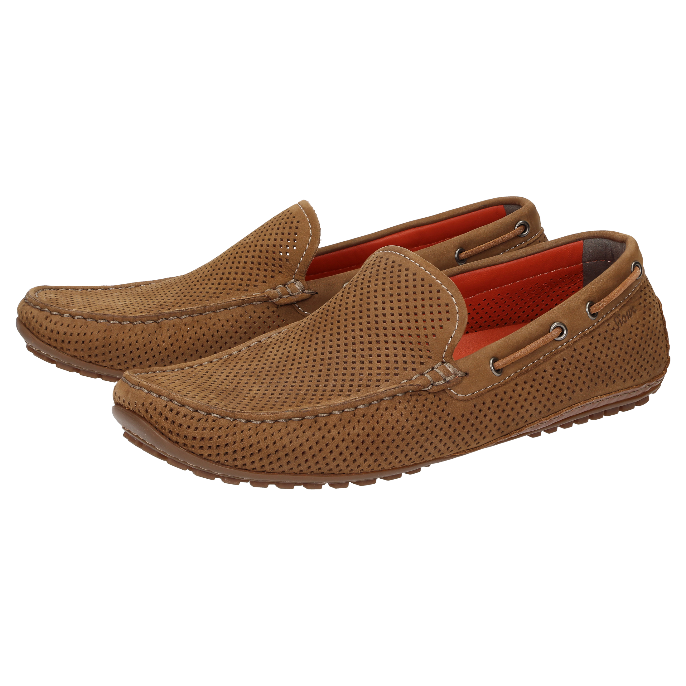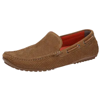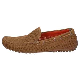 Sportlicher Herren-Mokassin-Slipper aus einer Kombination von feingeschliffenem Rindnubukleder und klassischem Kalbnappa handwerklich gefertigt. Das Modell hat ein Lederfutter und wird in normaler G-Weite handwerklich angefertigt. Die an der Ferse hochgezogene Autofahrer-Gummi-Noppensohle und das herausnehmbare, lederbezogene Wechselfussbett sorgen für einen angenehmen Auftritt.