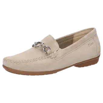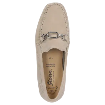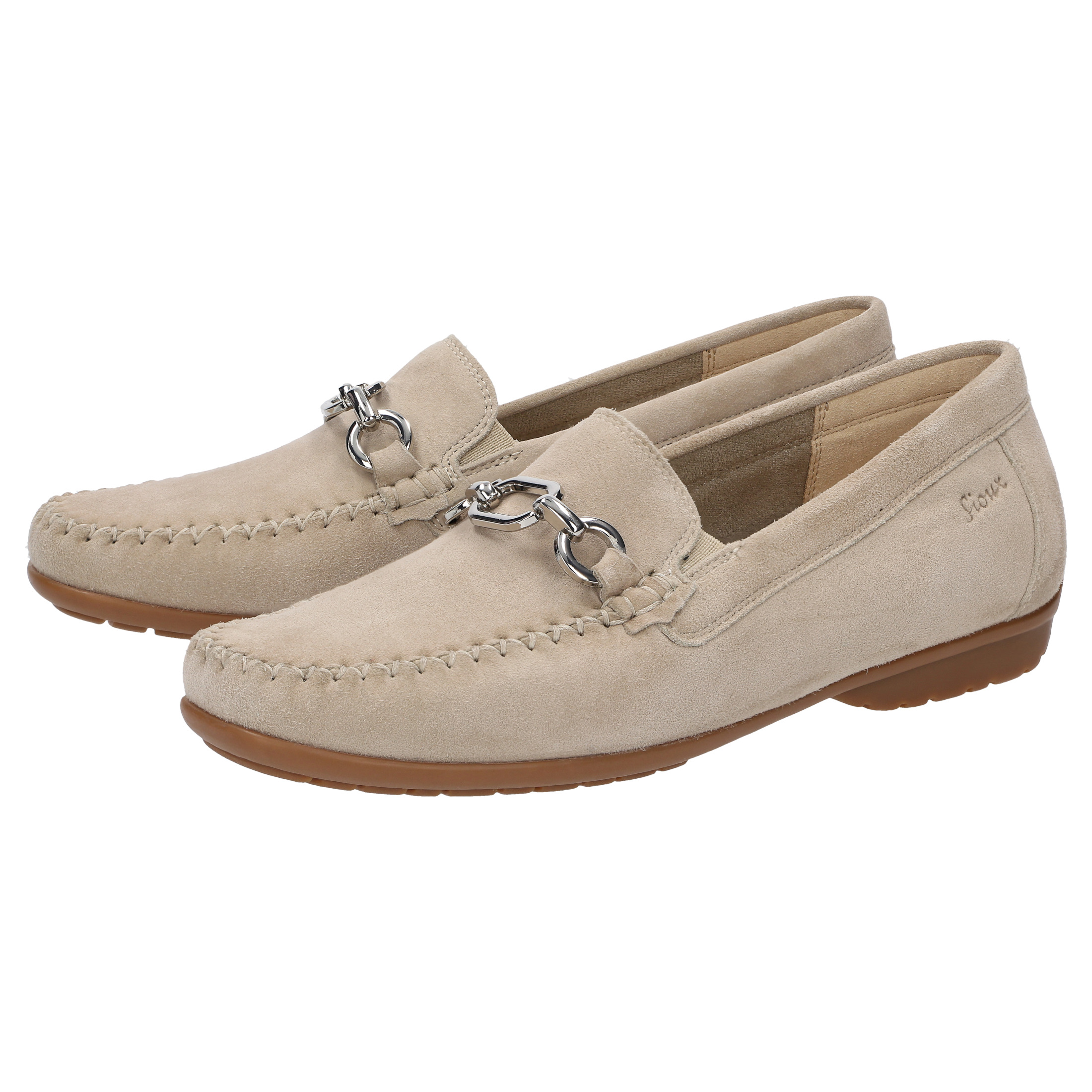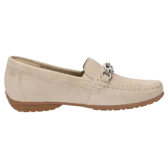 Sportlicher Damen-Mokassin in Weite H mit bewährter Passform. Handwerklich gefertigt aus feinem Ziegenvelour, mit bequemer Gummisohle und Wechselfussbett. Die zeitlose Metall-Garnitur macht dieses Modell zum Klassiker.