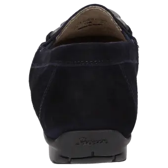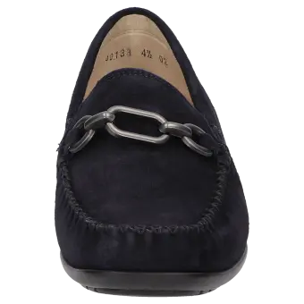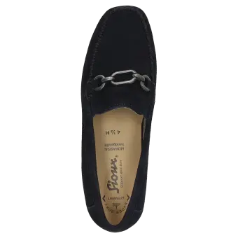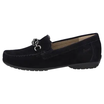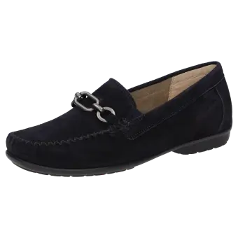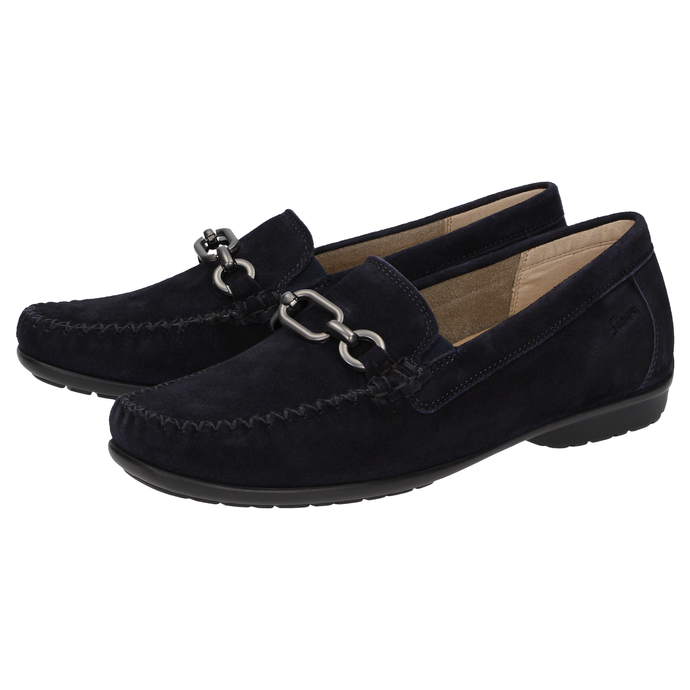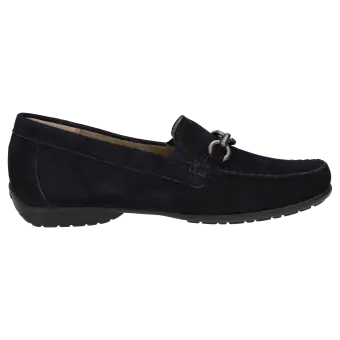 Sportlicher Damen-Mokassin in Weite H mit bewährter Passform. Handwerklich gefertigt aus feinem Ziegenvelour, mit bequemer Gummisohle und Wechselfussbett. Die zeitlose Metall-Garnitur macht dieses Modell zum Klassiker.