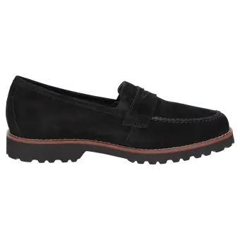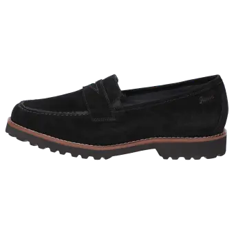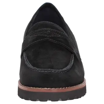 Damenslipper in bequemer H-Extra-Weite im College-Look mit Pennyloafer-Garnitur. Gefertigt aus sehr weichem Lammvelour-Leder und gefüttert mit Leder und einem Stretch-Textilfutter im Vorfussbereich. Für Hallux-Valgus-Füsse geeignet! Herausnehmbare, lederbezogene Decksohle mit weicher Dämpfung - auch geeignet zum Austausch mit der eigenen Einlage. Profilierte, herbstlich anmutende Leichtgummisohle mit markantem Lederrahmen.