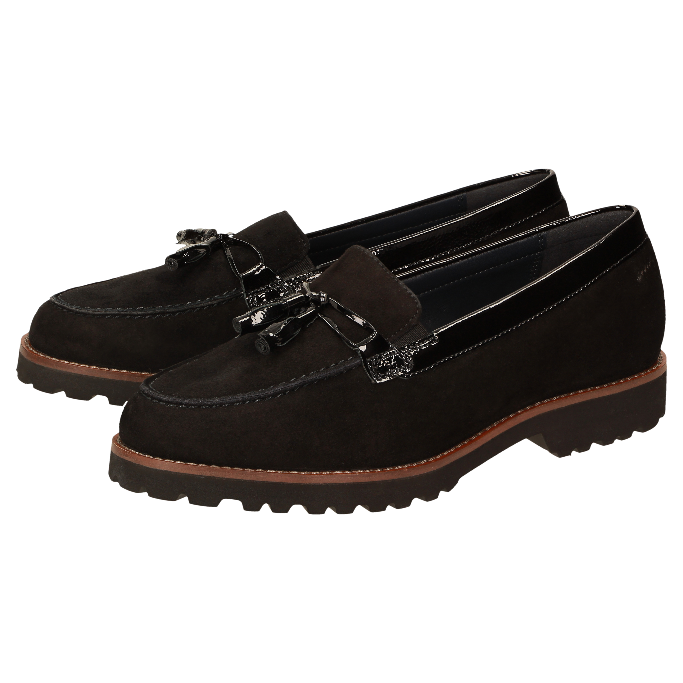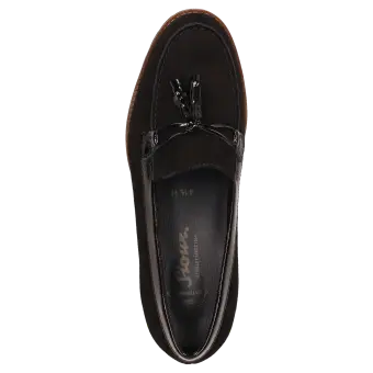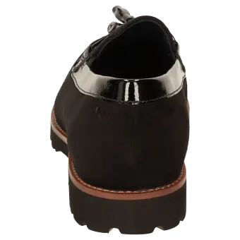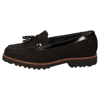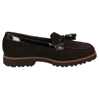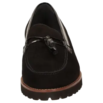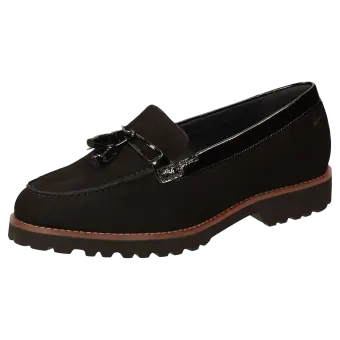 Damenslipper in bequemer H-Extra-Weite im College-Look mit modischer Pommel-Garnitur. Gefertigt aus feinem Lammvelour und geknautschtem Lackleder, gefüttert mit Leder und einem Stretch-Textilfutter im Vorfussbereich. Für Hallux-Valgus-Füsse geeignet! Herausnehmbare, lederbezogene Decksohle mit weicher Dämpfung - auch geeignet zum Austausch mit der eigenen Einlage. Profilierte, herbstlich anmutende Leichtgummisohle mit markantem Lederrahmen.