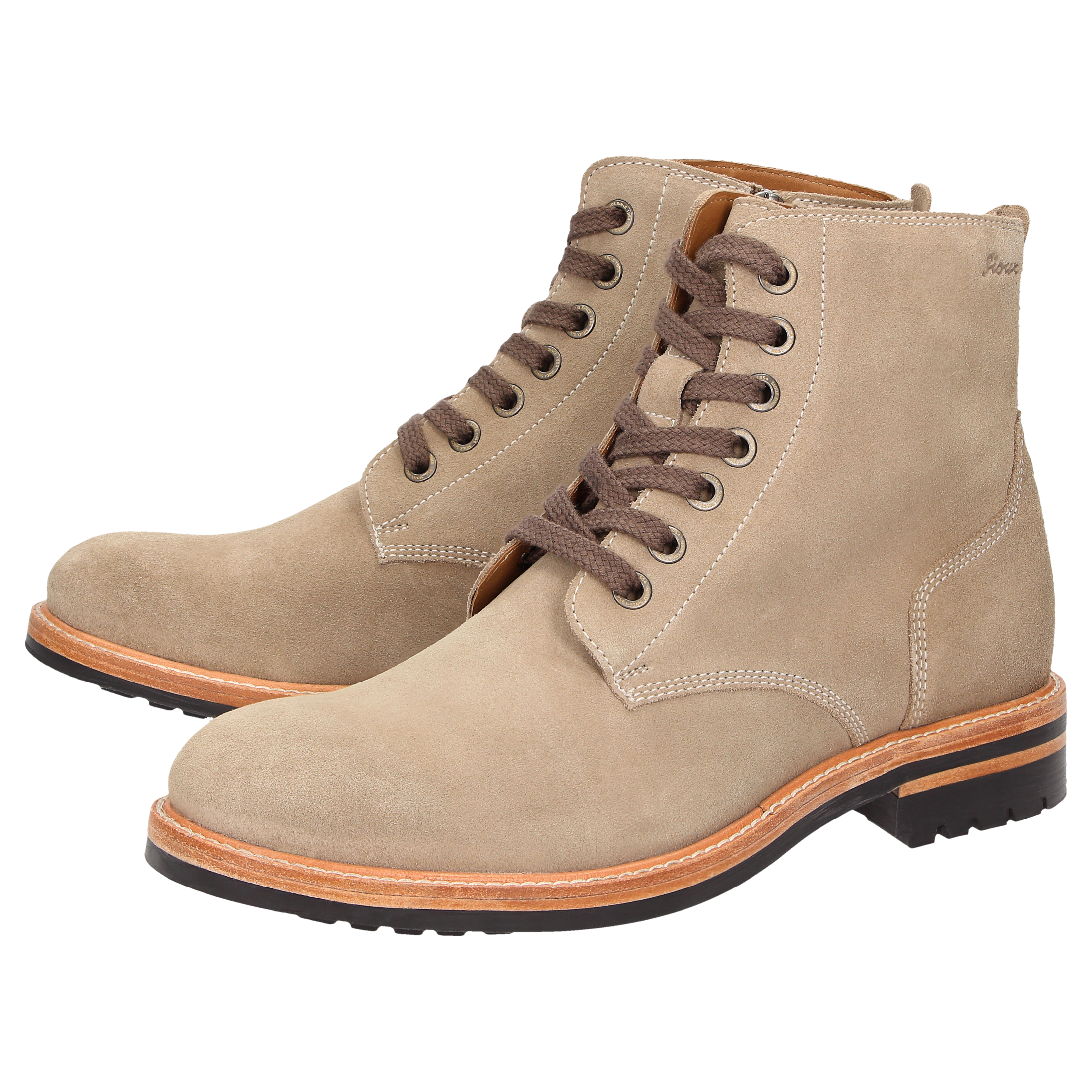 Kernig wie Til Schweiger: kräftiger Schnür-Bootie mit Innenreissverschluss - wenn es schnell gehen muss. Handwerklich gemacht aus klassischem Kalbvelour-Leder aussen und Kalblederfutter mit gepolsterter Lederdecksohle innen. Die Gummilaufsohle mit markantem Profil und aufgesetzten Lederrahmen geben dem Bootie eine markante Optik.