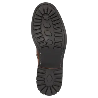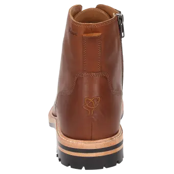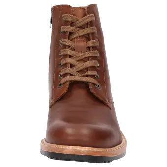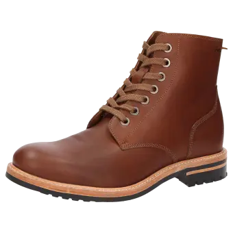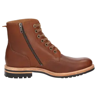 Kernig wie Til Schweiger: kräftiger Schnür-Bootie mit Innenreissverschluss - wenn es schnell gehen muss. Handwerklich gemacht aus geöltem Kalbleder aussen und Kalblederfutter mit gepolsterter Lederdecksohle innen. Die Gummilaufsohle mit markantem Profil und aufgesetzten Lederrahmen geben dem Bootie eine markante Optik.